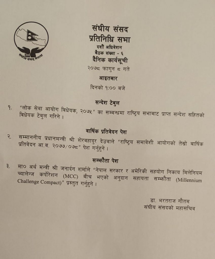 प्रतिनिधिसभा बैठकको सार्वजनिक कार्यसूचीमा एमसीसीलाई समेटिएको छ । कार्यसूचीको तेस्रो बुँदामा एमसीसी प्रस्तुत गर्ने उल्लेख गरिएको छ ।