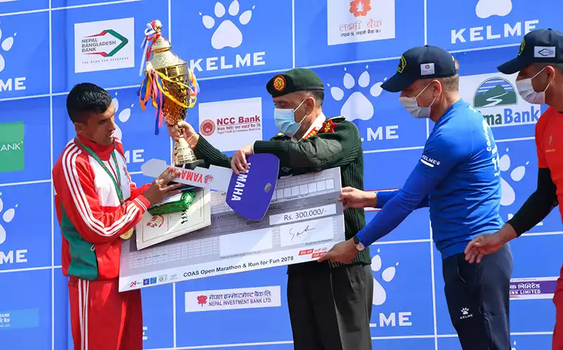 विजयी प्रतियोगीलाई प्रधानसेनापति प्रभुराम शर्मा, रक्षा सचिव किरणराज शर्मा र युवा तथा खेलकुद मन्त्रालयका सचिव डा दामोदर रेग्मीलगायतले नगद पुरस्कार एवं प्रमाणपत्र प्रदान गरेका थिए । सैनिक मुख्यालय जङ्गीअड्डा परिसरको खेल मैदानमा यसअघि म्याराथनसहित विभिन्न चार विधाका दौड प्रतियोगिताको प्रधानसेनापति शर्माले उद्घाटन गरेका थिए ।