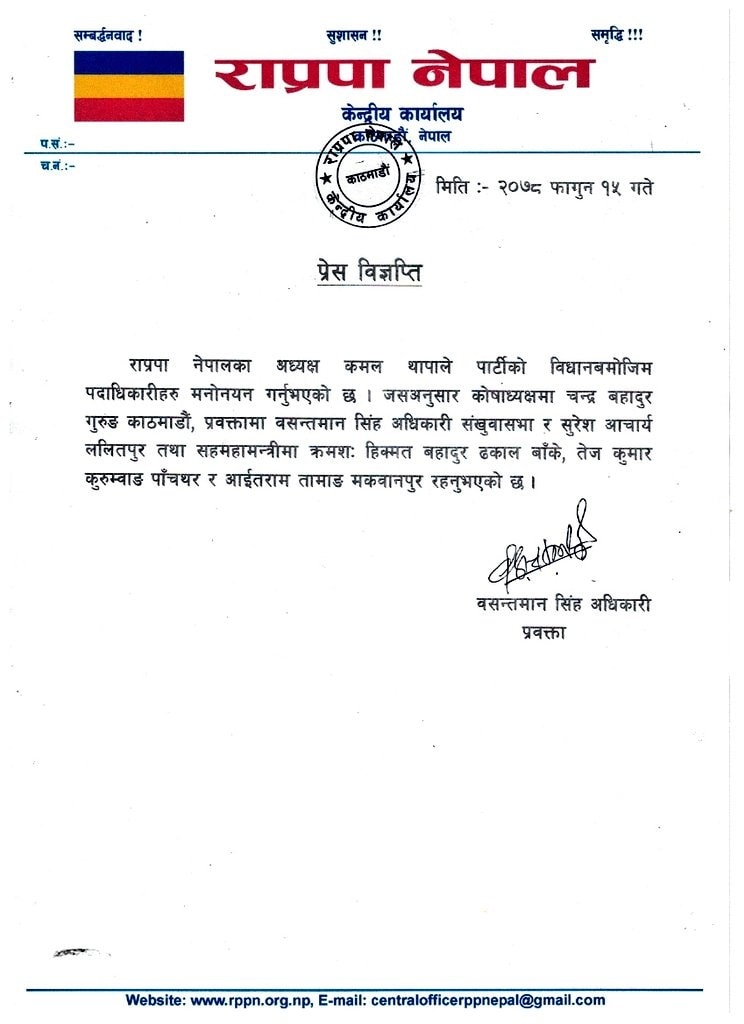 काठमाडौं । राप्रपा नेपालका अध्यक्ष कमल थापाले पदाधिकारी मनोनयन गरेका छन् ।