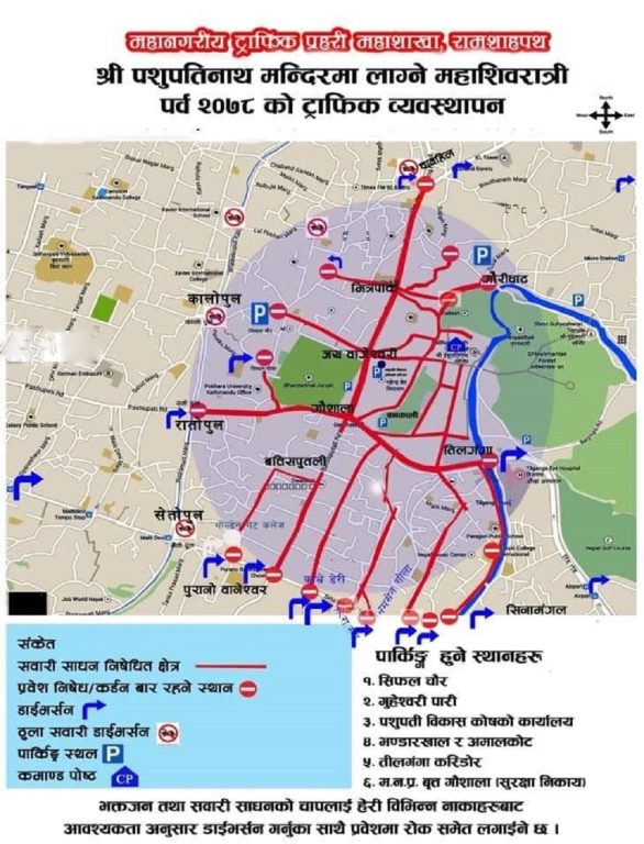 पशुपतिनाथ परिसरमा लाखौँ भक्तजन उपस्थित हुने भएकाले शिवरात्रिका दिन गौशाला, बत्तीसपुतली, मित्रपार्क, जयवागीश्वरी, गौरीघाटमा सवारीसाधन निषेधित क्षेत्र रहनेछन्।