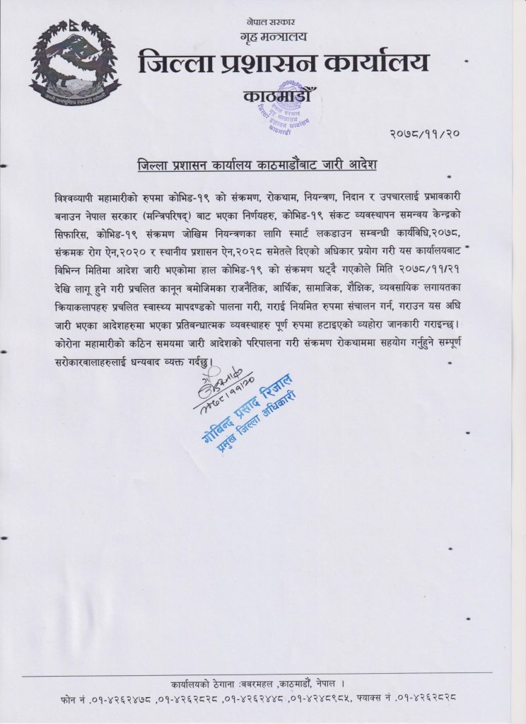 काठमाडौं।जिल्ला प्रशासन कार्यालय काठमाडौंले कोभिड–१९ को संक्रमण रोकथामका लागि लगाएका सबै प्रतिबन्ध हटाउने भएको छ ।
