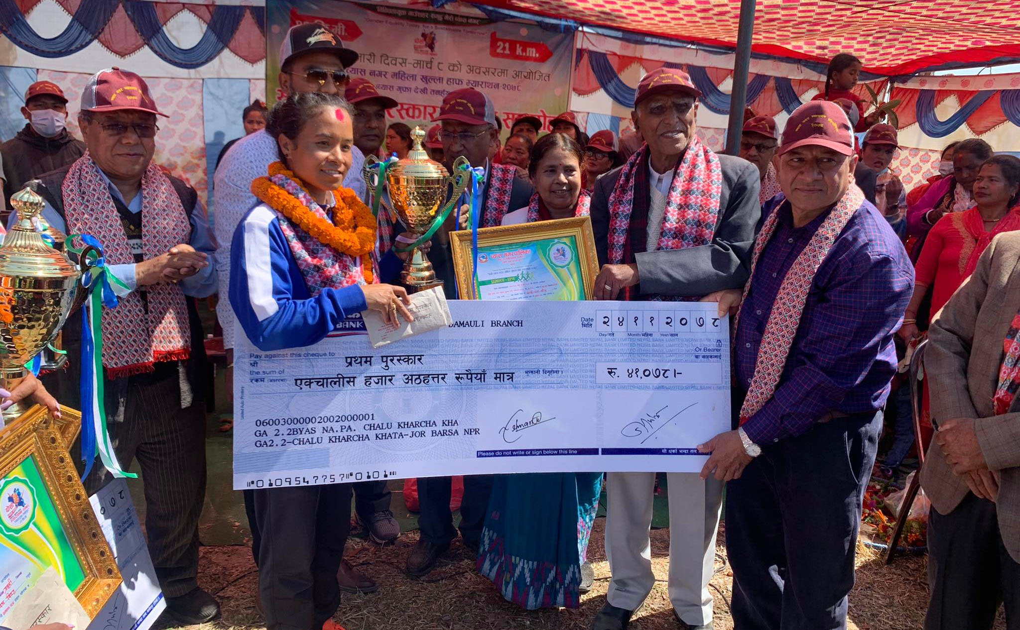५० जना धाविकालाई पछाडि पार्दै कान्छीमायाले नगद ४१ हजार ७८ रुपैयाँ प्राप्त गरेकी छन् । व्यास नगरपालिका–३ मा रहेको व्यास गुफाबाट सुरू भएको म्याराथन व्यास नगरपालिका–११ तनहुँसुरमा पुगेर सकिएको थियो । २१ किलोमिटर दुरीमा म्याराथन भएको हो ।
