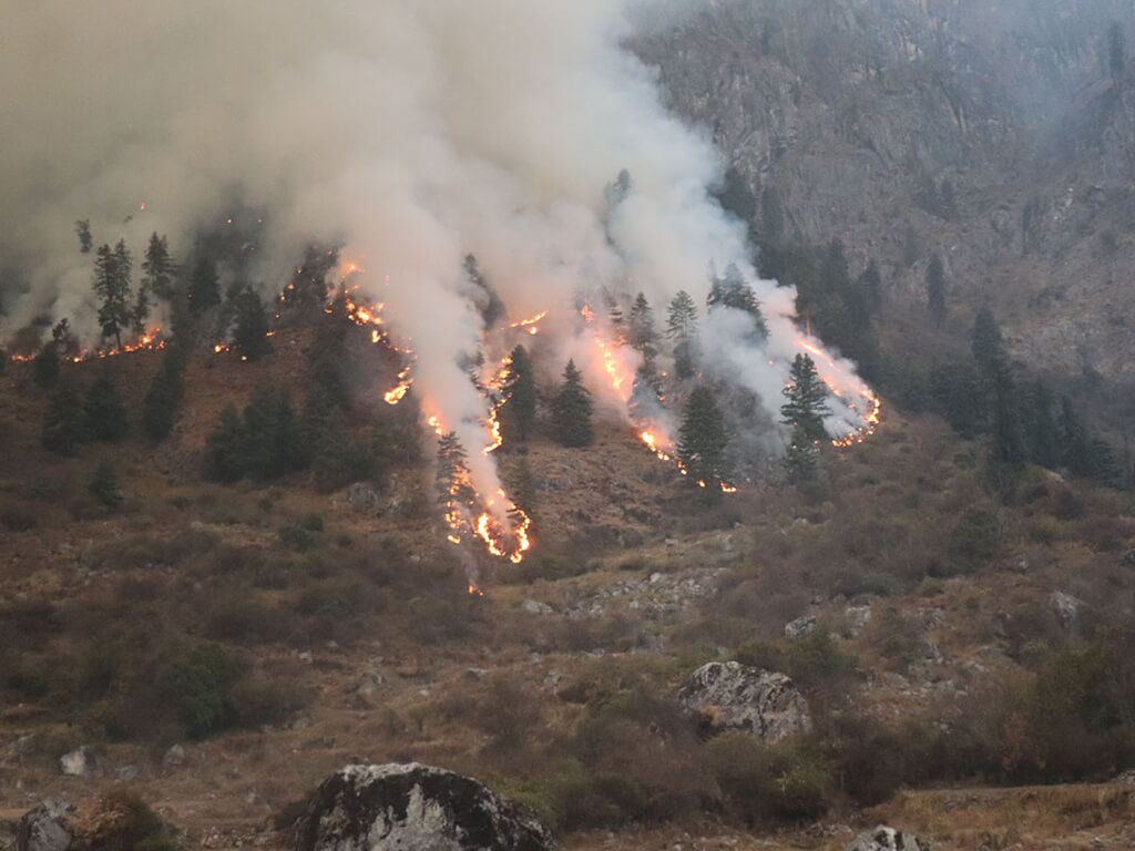 सोलुखुम्बु। खुम्बु पासाङल्हामु गाउँपालिका–२ मा पर्ने हरियाली सामुदायिक वनमा लागेको डढेलोका कारण बस्ती जोखिममा परेको छ । आइतबार रातिदेखि लागेको डढेलो नियन्त्रण बाहिर हुँदा सोही गाउँपालिका वडा नं २ को नाक्चुङबस्ती जोखिममा परेको वडाध्यक्ष आङ्फुर्वा शेर्पाले जानकारी दिए ।