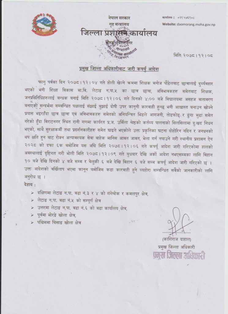 हालको अवस्थालाई दृष्टिगत गरी चैत ९ गते बुधबारदेखि अर्को आदेश नभएसम्मका लागि बिहान १० बजेदेखि दिउँसो ४ बजेसम्म र साँझ ६ बजजेदेखि बिहान ६ बजेसम्म कर्फ्युको आदेश जारी गरिएको मोरङका प्रमुख जिल्ला अधिकारी काशीराज दाहालले जानकारी दिए ।