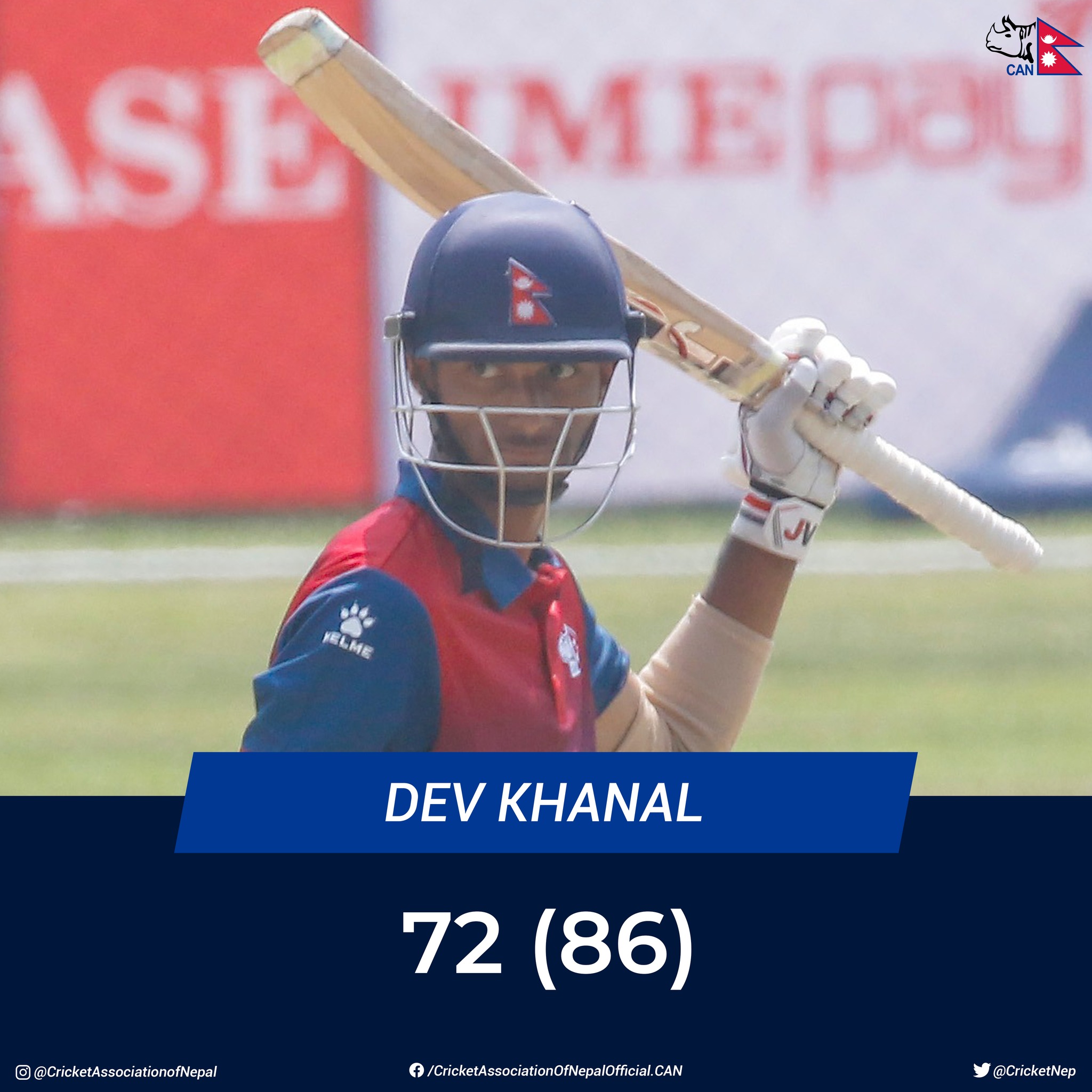 नेपालले शुरुवाती दुई विकेट सस्तैमा गुमाएपछि दबाबमा देवले अर्धशतक बनाएर नेपालको पारीलाई सम्हालेका छन् भने दिपेन्द्र सिंह ऐरीले पनि उत्कृष्ट ब्याटिंग गर्दै ४१ रन बनाएर खेलिरहेका छन् ।