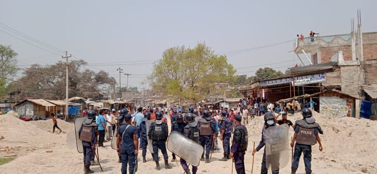 धनुषा । धनुषाको विदेह नगरपालिकास्थित तिनकौरीया चोकमा स्थानीय र प्रहरीबीच झडप भएको छ । शनिबार राति साढे ११ बजे स्थानीय सन्तोषकुमार मण्डलले सञ्चालन गरेको शान्ता पान पसलमा आगजनीको विषयमा स्थानीयले बिहानैदेखि सडक अवरुद्ध पारेर प्रदर्शन गरिरहेका थिए । सोही सडक खुलाउने विषयमा प्रहरीले बल प्रयोग गर्दा झडप भएको हो ।