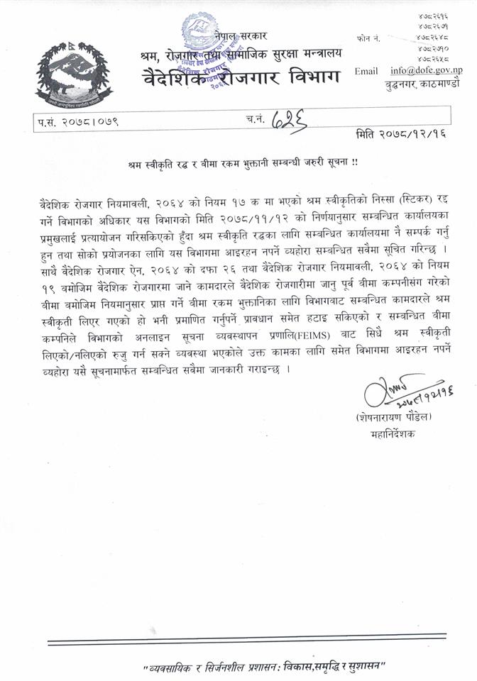 बिमा रकम भुक्तानी सम्बन्धिको सेवा समेत सम्बन्धित कार्यालय प्रमुखबाट हुने भएको छ । श्रम स्वीकृति रद्दका लागि सम्बन्धित कार्यालयमा नै सम्पर्क गर्नु हुन विभागले सबैमा अनुरोध गरेको छ । त्यसका लागि विभागमा आइरहनु नपर्ने विभागका महानिर्देशक शेषनारायण पौडेलले जानकारी दिए ।