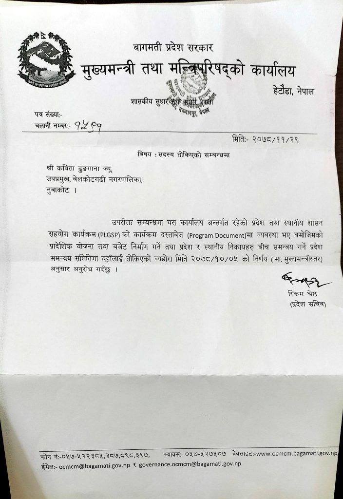 मुख्यमन्त्री तथा मन्त्रिपरिषद्को कार्यालयक मुख्य सचिव स्किम श्रेष्ठले हस्ताक्षर गरेको पत्रमा मुख्यमन्त्री कार्यालय अन्तरगत रहेको प्रदेश तथा स्थानीय शासन सहयोग कार्यक्रमको कार्यक्रम दस्तावेजमा व्यवस्था भए अनुसार ‘प्रदेश समन्वय समिति’को विस्तार गर्ने क्रममा नेकपा माओवादी केन्द्रको तर्फबाट उपाध्यक्षमा बिजयी हुनुभएका कविता ढुङ्गानालाई सदस्यको जिम्मेवारी दिइएको हो ।