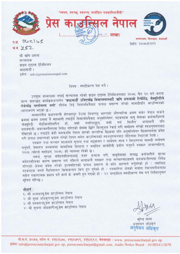काठमाडौँ । प्रधानमन्त्री शेरबहादुर देउवा चढेको विमानभित्र गलत हर्कत गरेको विषयमा पत्रकार ऋषि धमलालाई प्रेस काउन्सिल नेपालले स्पष्टीकरण सोधेको छ ।