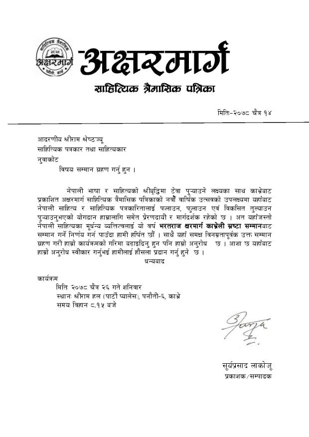 नेपाली साहित्य र साहित्यिक पत्रकारितामा गरेको योगदानको उच्च मुल्यांकन गर्दै नुवाकोट साहित्य प्रतिष्ठानका संस्थापक अध्यक्ष एवम् साहित्यकार श्रेष्ठलाई यही चैत्र २६ गते शनिबार पनौतीमा हुने वार्षिकोत्सव समारोहमा श्रेष्ठलाई सम्मान गर्न लागिएको अक्षरमार्ग पत्रिकाका प्रकाशक सूर्यप्रसाद लाकोजूले जानकारी दिए।