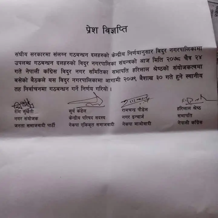 ‘संघीय सरकारमा संलग्न गठबन्धन दलहरुको केन्द्रीय निर्णयानुसार विदुर नगरपालिकामा उपलब्ध गठबन्धन दलहरुको विदुर नगरपालिका संयन्त्रको आज मिति २०७८ चैत्र २४ गते नेपाली कांग्रेस विदुर नगरसभापति हरिलाल श्रेष्ठको संयोजकत्वमा बसेको बैठकले यस विदुर नगरपालिकामा आगामी २०७९ वैशाख ३० गते हुने स्थानीय तह निर्वाचनमा गठबन्धन गर्ने निर्णय गरियो ।’ जारी संयुक्त विज्ञप्तिमा भनिएको छ ।