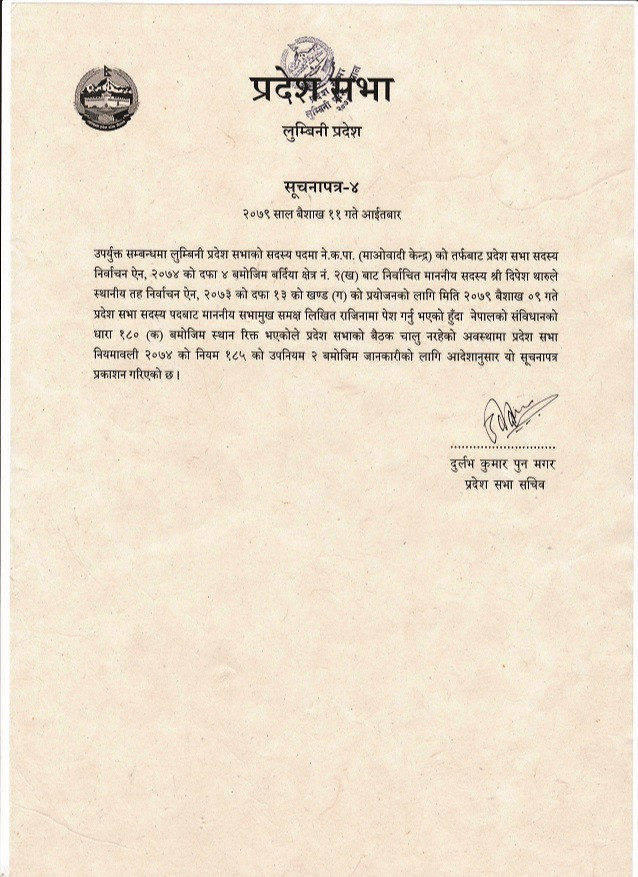 प्रदेशसभा सचिवालयले सोमबारको मितिमा जारी गरेको सूचनामा नेपालको संविधानको धारा १८० (क) बमोजिम थारुले जितेको उक्त निर्वाचन क्षेत्र रिक्त भएको जनाएको छ ।