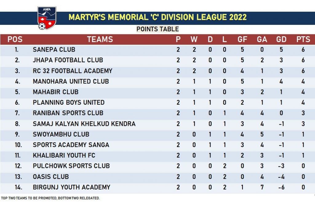 जारी लिगमा समान ६ अंक भए पनि सानेपा, झापा र आरसी ३२ क्रमशः पहिलो दोस्रो र तेस्रो स्थानमा छन् । समान चार अंकका साथ मनोहरा, महावीर र प्लानिङ क्रमशः चौँथो देखि छैटौँ स्थानसम्म छन् ।