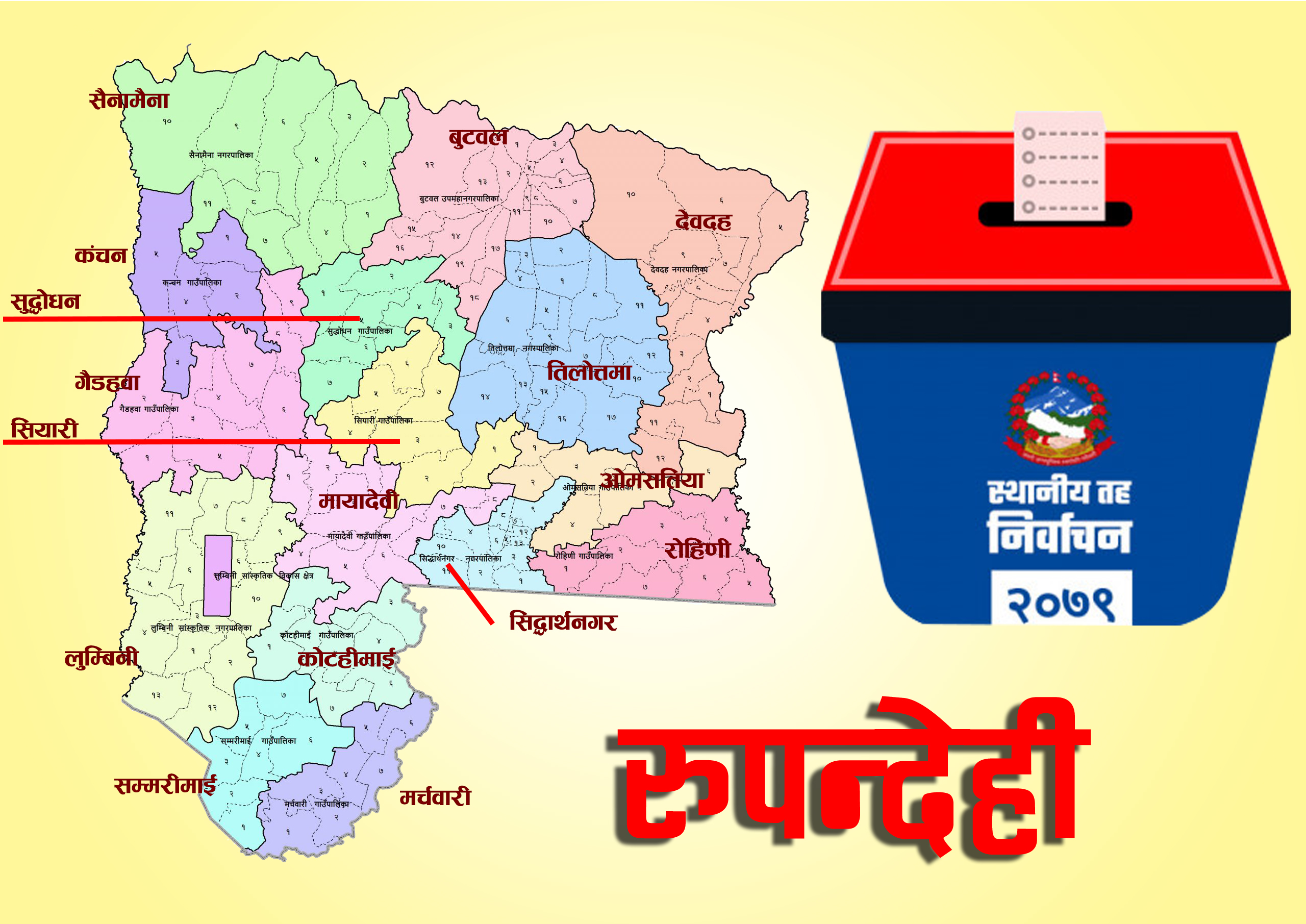 त्यसैगरी, ओमसतियाबाट ३ जना अध्यक्षसहित २३ जनाले उम्मेदवारी फिर्ता लिएका छन । कंचनबाट ३ जना, कोटहीमाईबाट ५ जनाले, गैडहवाबाट २ जना, तिलोत्तमाबाट ९ जना र देवदहबाट १४ जनाले उम्मेदवारी फिर्ता लिएका छन ।