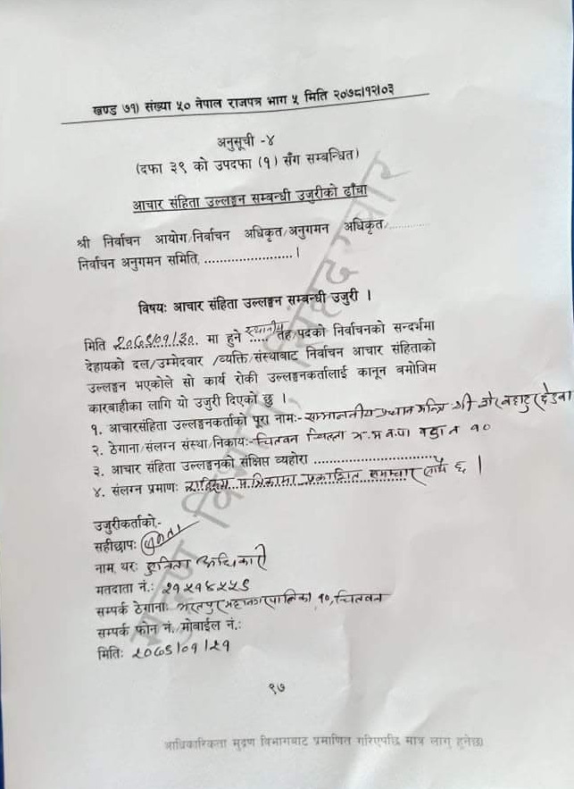 २२ वैशाखका दिन नेपाली कांग्रेस, माओवादीसमेतका गठबन्धनका उम्मेद्वारको पक्षमा शेरबहादुर देउवालगायत नेपाल सरकार तथा प्रदेश सरकारको मन्त्रीहरू सहभागी हुने कुरा राष्ट्रिय समाचार पत्रिकामा प्रकाशित भएको हुँदा आचारसंहिताविपरीत हुन लागेको कार्यक्रम स्थगित गरी पाउँ र आचारसंहिताविपरीत कार्य भएमा सजाय समेत गरी पाऊँ, उजुरीमा भनिएको छ ।