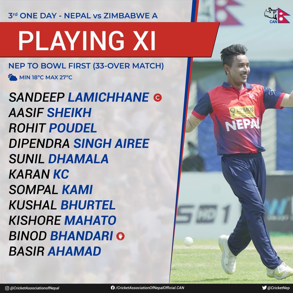 काठमाडौं । जिम्बाब्बे ए र नेपालबीचको अन्तिम तथा निर्णायक खेलमा नेपालले पहिला बलिङ राेजेको छ ।