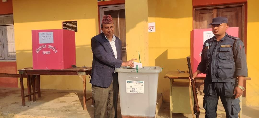 महासचिव पोखरेलले सामाजिक सञ्जाल फेसबुकमा लेखेका छन्, ‘विहानीको घमाइलोमा तुल्सीपुर उपमहानगर पालिका वडा नम्बर १९ को जनता विद्यापीठ बिजौरी मतदान केन्द्रमा मतदान गरियो ।’