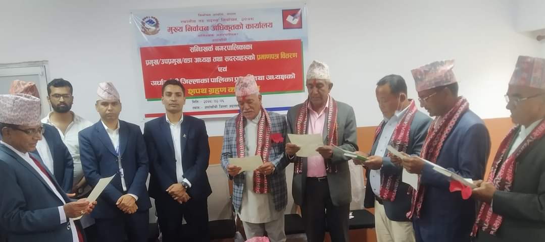 काठमाडौं । अर्घाखाँची जिल्लाका पालिकामा नवनिर्वाचित प्रमुख तथा अध्यक्षहरूलाई सन्धिखर्कमा सपथ ग्रहण गराइएको छ ।