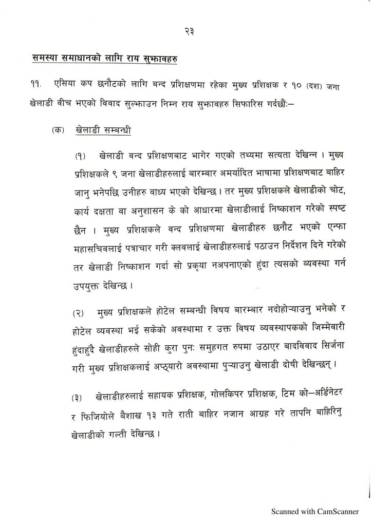 खेलाडी र प्रशिक्षक, व्यवस्थापन सबै पक्षको दोष देखाइएको सन्तुलित प्रतिवेदनले सबै पक्षलाई सचेत गराउने मात्र भनिएको छ ।