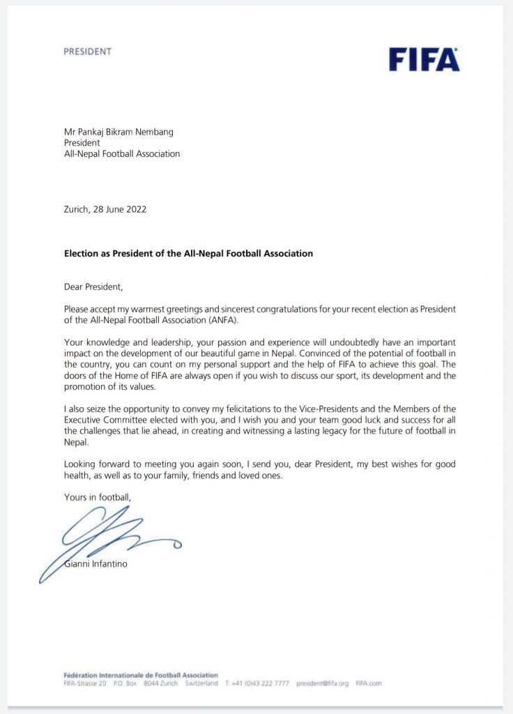 त्यसको आठ दिनपछि फिफा अध्यक्ष जियानीले पत्रमार्फत बधाई दिएका हुन् ।