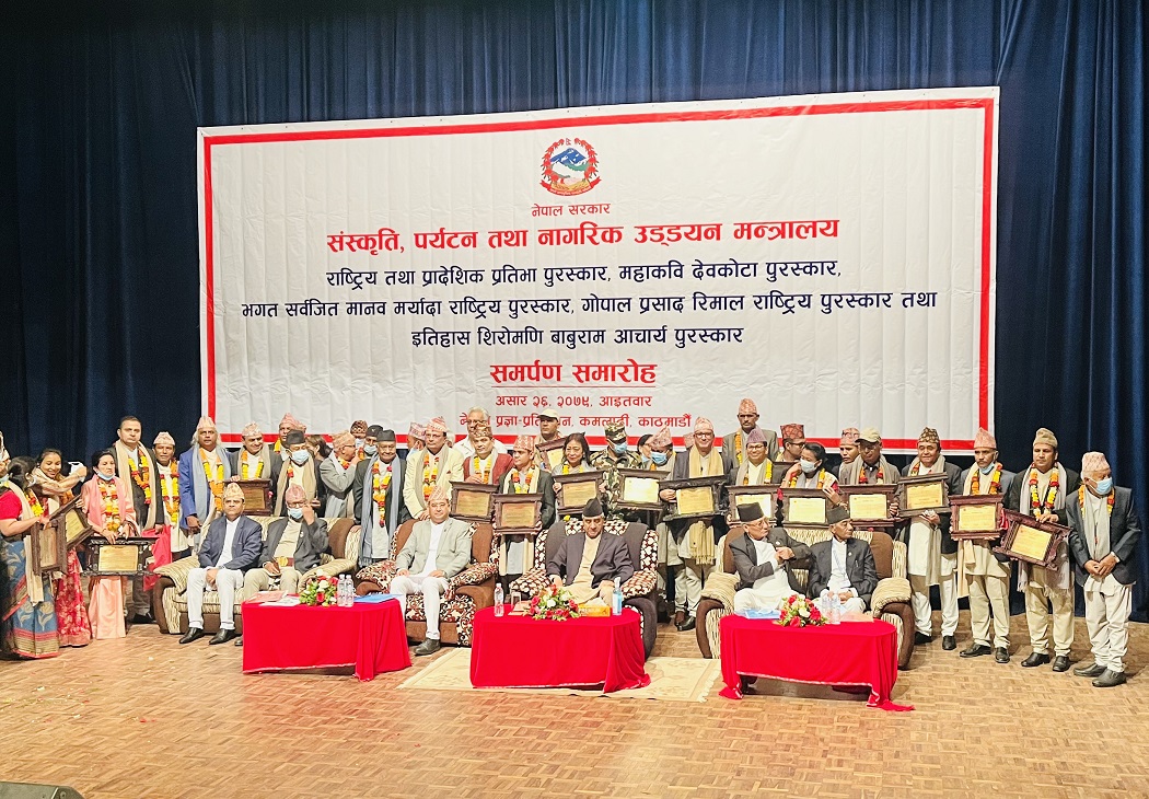 काठमाडाैं।संस्कृति, पर्यटन तथा नागरिक उडड्यन मन्त्रालयलेविभिन्न विधाका ४३ जना श्रष्टालाई पुरस्कृत गरेको छ । काठमाडौंको कमलादीस्थित नेपाल प्रज्ञा प्रतिष्ठानमा मन्त्रालयले आइतबार आयोजना गरेको कार्यक्रममा प्रधानमन्त्री शेरबहादुर देउवा र संस्कृति, पर्यटन तथा नागरिक उडड्यनमन्त्री जीवनराम श्रेष्ठले पुरस्कृतश्रष्टाहरुलाई नगद पुरस्कारसहित सम्मान गरेका हुन् ।