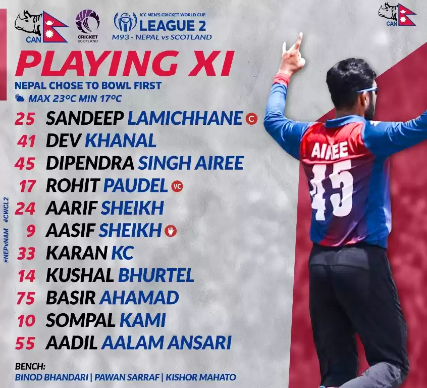 काठमाडौं । आईसीसी पुरुष विश्वकप लिग टू अन्तर्गतको त्रिकोणात्मक सिरिजको दोश्रो खेलमा स्कटल्याण्डविरुद्ध नेपालले टस जितेर पहिले फिल्डिङ गर्ने निर्णय गरेको छ ।