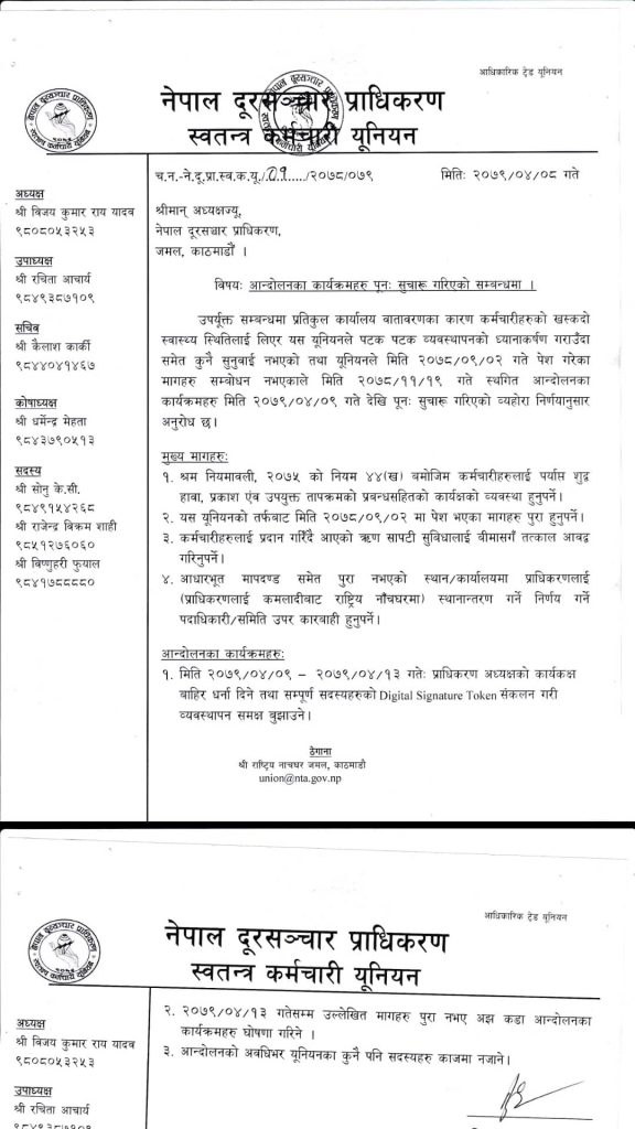 काठमाडौं । नेपाल दूरसञ्चार प्राधिकरणका कर्मचारी चार बुँदे माग राखेर आन्दोलनमा उत्रिएका छन् । नेपाल दूरसञ्चार प्राधिकरण स्वतन्त्र कर्मचारी युनियनले सोमबारदेखि आन्दोलनमा उत्रिने प्राधिकरण अध्यक्षलाई चेतावनीसहितको पत्र बुझाएको छ ।