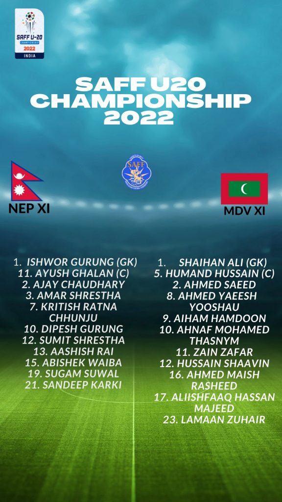काठमाडौं । यु-२० साफ च्याम्पियनसिपअन्तर्गत उद्घाटन खेलमा माल्दिभ्सविरुद्ध खेल्ने नेपाली टिमको सुरुवाती एघार सार्वजनिक भएको छ ।