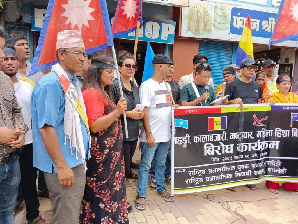 काठमाडौं । राप्रपाले काठमाडौंसहित देशभरका सबै जिल्लामा भ्रष्टाचारविरुद्धमा कालोपट्टी लगाएर विरोध प्रदर्शन गरेको छ । बुधबार पार्टीनिकट सबै जनवर्गीय संगठनको संयुक्त आयोजनामा कालोपट्टी बाँधेर प्रदर्शन भएको राप्रपा प्रवक्ता तथा प्रचार विभाग प्रमुख मोहन श्रेष्ठले जानकारी दिए ।