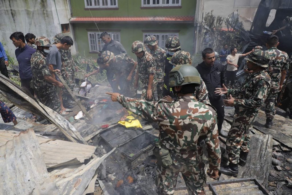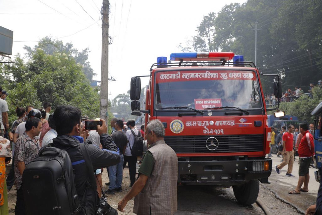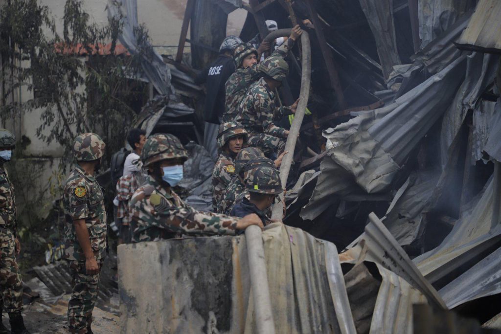 काठमाडौँ महानगरपालिका–१६ बालाजु बाइपास नजिकको जुत्ता कारखानामा बुधबार बिहानदेखि लागेको आगो नियन्त्रण गर्दै अग्नी नियन्त्रक र सुरक्षाकर्मीहरू । घण्टौंको प्रयासपछि आगो नियन्त्रणमा आएको थियो । आगो नियन्त्रणमा आए पनि जुत्ता कारखाना जलेर खरानी भएको छ । कारखानाभित्रका सबै सामान काम नलाग्ने भएका छन् । आगलागीको कारण पनि खुल्न