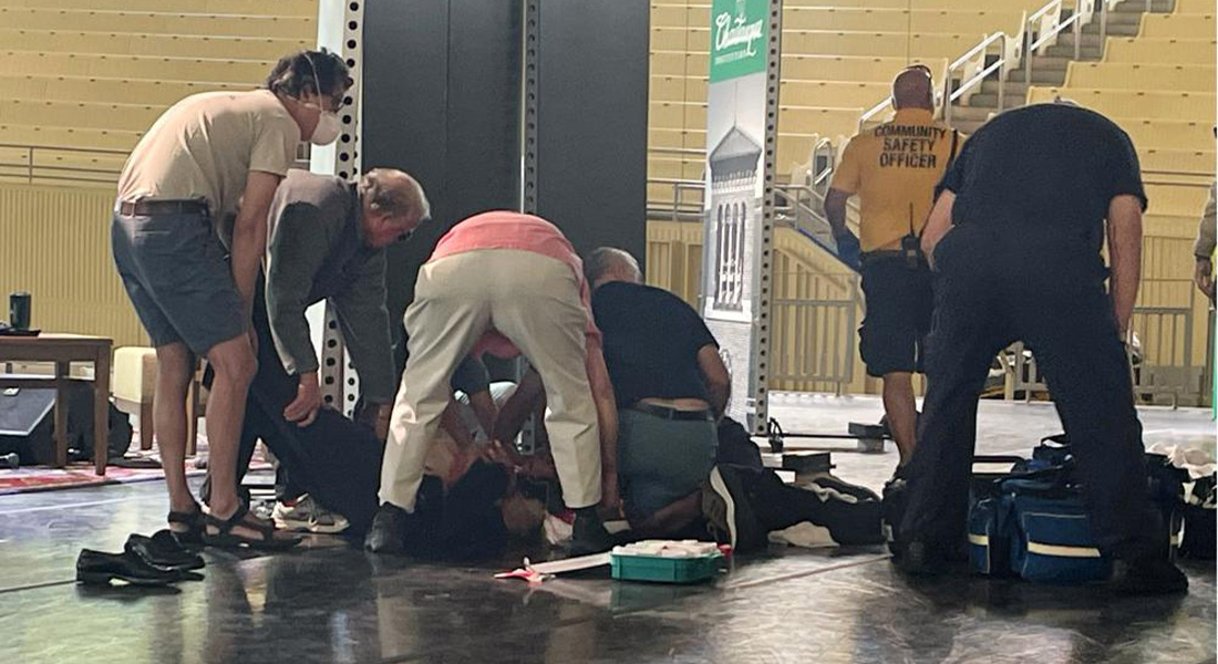 एपीका सम्वादाताकाअनुसार एक जनाले चौताउवा इन्स्टिच्युटमा स्टेजमा आएर रुस्दीलाई मुक्का वा छुरा प्रहार गरेका थिए । त्यसपछि लेखकलाई लडाइएको वा भुइँमा ढलेका थिए । तस्बिरहरूमा रुस्दी उत्तानो परेर लडेको देखिन्छ भने पहिलो प्रतिक्रियाकर्ता उनीमाथि झुकेको देखिन्छ ।