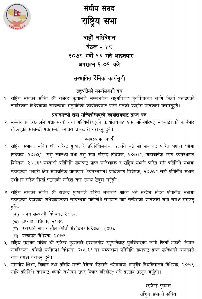 भोलिको बैठकको सम्भावित दैनिक कार्यसूचीमा राष्ट्रिय सभाका सचिव राजेन्द्र फुयाँलले सम्माननीय राष्ट्रपतिबाट पुनर्विचारका लागि फिर्ता पठाइएको नागरिकता विधेयकका सम्बन्धमा राष्ट्रपतिको कार्यालयबाट प्राप्त पत्रको ब्यहोरा जानकारी गराउने रहेको छ ।