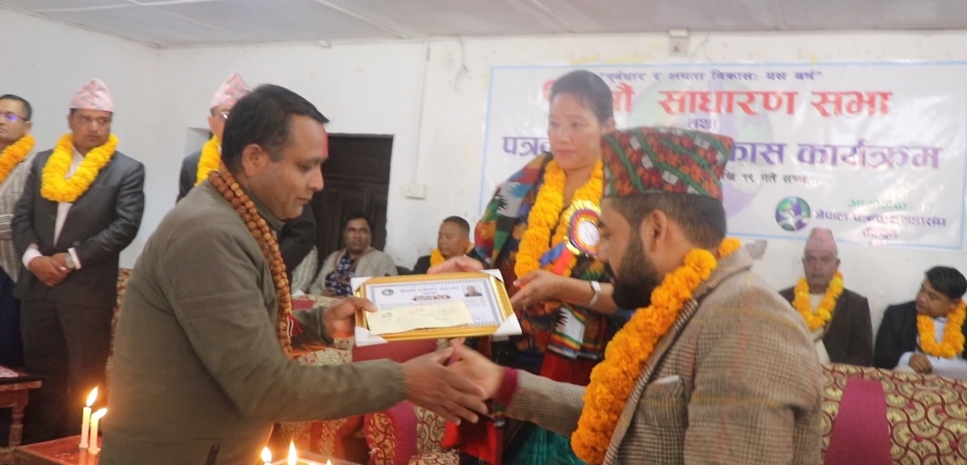 काठमाडौं । नेपाल पत्रकार महासंघ तेह्रथुमले १२औँ साधारण सभाको अवसरमा जिल्लाका आठ जना पत्रकारलाई सम्मान गरेको छ । महासंघले कान्तिपुर मिडिया ग्रुपका संवाददाता चन्द्र कार्कीलाई तेह्रथुम क्रियाशील पत्रकारिता पुरस्कार ०७९ बाट पुरस्कृत गरेको छ । यस्तै, महासंघ जिल्ला शाखाका पूर्व अध्यक्ष तथा रेडियो तेह्रथुमका सहायक स्टेसन म्यानेजर नरेश ढुंगाना पनि सम्मानित भएका छन् ।