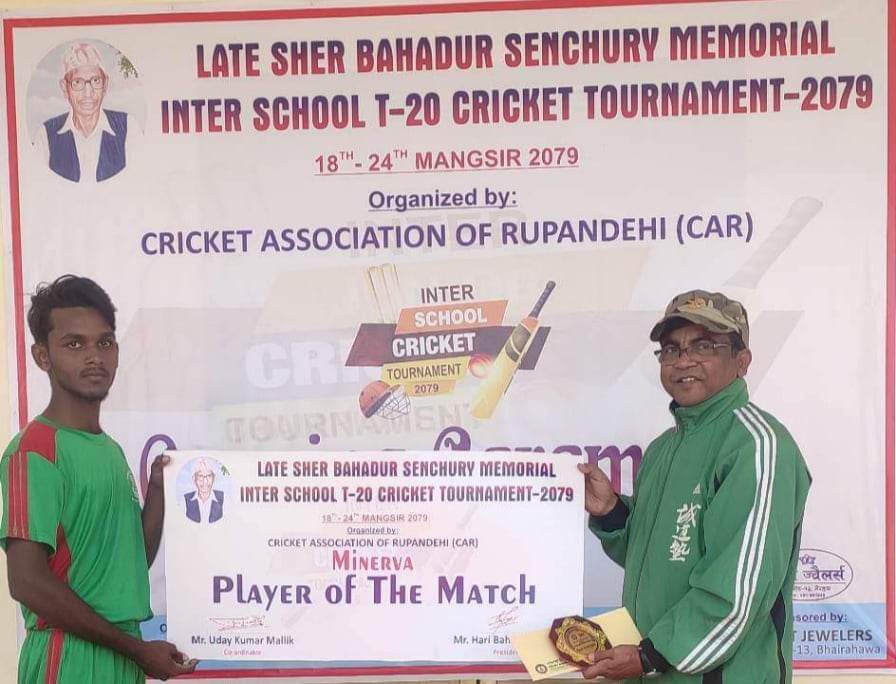 रुपन्देही क्रिकेट संघको आयोजनामा शुक्रबार भएको सेमिफाइनल खेलमा लुम्बिनीले काशी नोबल एकेडेमी, भैरहवालाई २२ रन र शान्ति नमूनाले साइग्लोबल स्कूल, भैरहवालाई ७० रनले पराजित गर्दै फाइनल यात्रा तय गरेका हुन् । लुम्बिनी र शान्ति नमूनाबीच शनिबार उपाधिका लागि प्रतिस्पर्धा हुनेछ ।