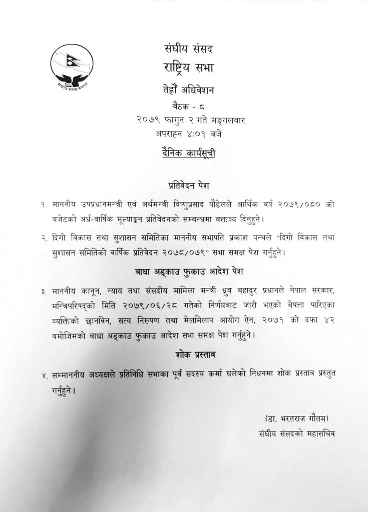 काठमाडौं । सङ्घीय संसद्अन्तर्गतको राष्ट्रिय सभा बैठक सुरु भएको छ । सङ्घीय संसद्को महासचिव डा. भरतराज गौतमले मङ्गलबार अपराह्न ४ बजेर १ मिनेटमा बैठक सुरु भएको जानकारी दिए । आजको बैठकमा उपप्रधान एवम् अर्थमन्त्री विष्णुप्रसाद पौडेलले आर्थिक वर्ष २०७९/०८० को बजेटको अर्थ–वार्षिक मूल्याङ्कन प्रतिवेदनको सम्बन्धमा वक्तव्य दिने कार्यक्रम रहेको छ ।