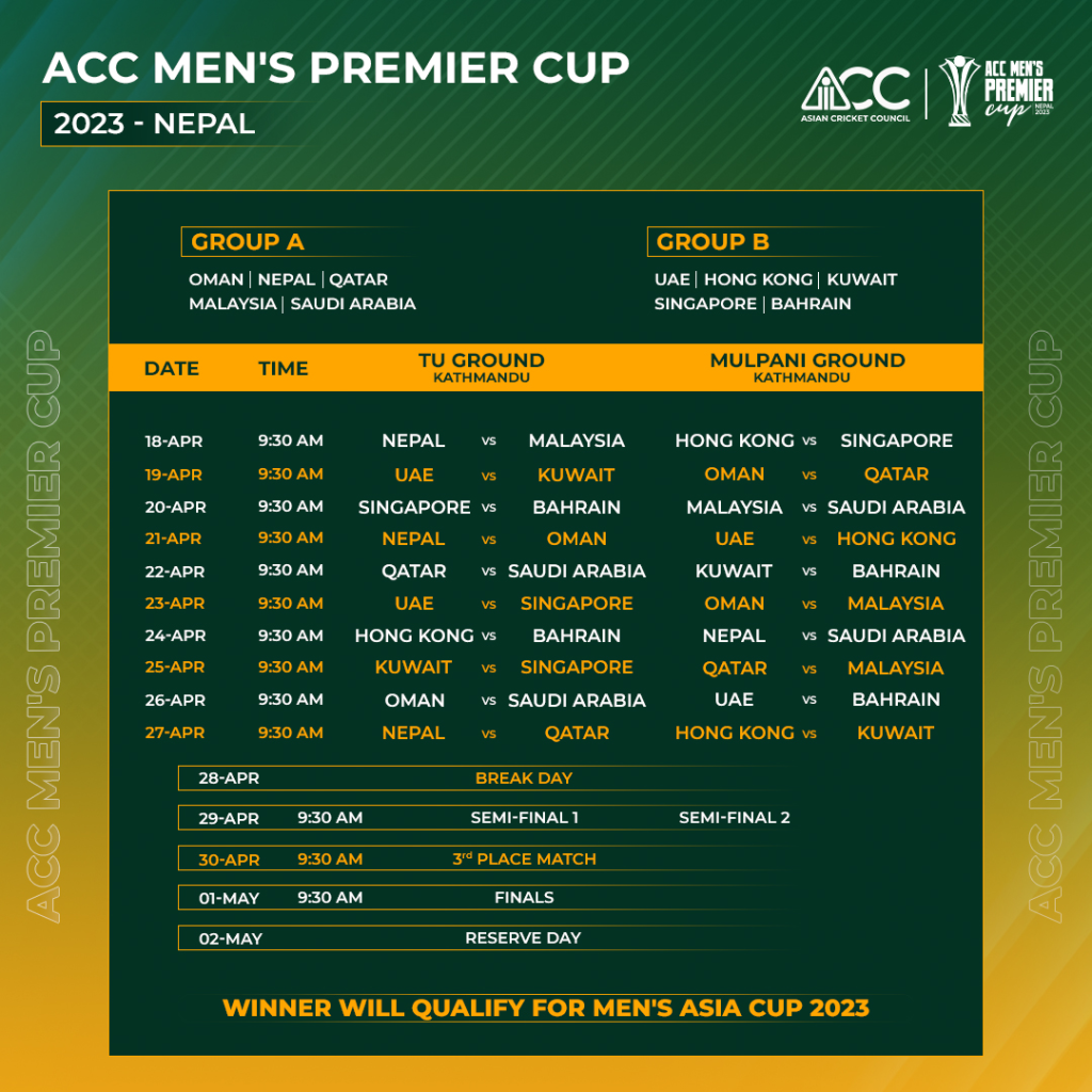 काठमाडौं।एसिसी प्रिमियर कपको खेल तालिका सार्वजनिक भएको छ। एसियन क्रिकेट काउन्सिल (एसिसी) ले प्रतियोगिता वैशाख ५ देखि वैशाख १८ सम्म कीर्तिपुरस्थित त्रिवि मैदान र मुलपानी मैदानमा हुने खेल तालिका सार्वजनिक गरेको हो।