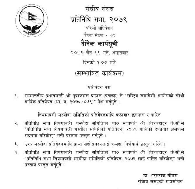 त्यस्तै, प्रतिनिधिसभा नियमावली मस्यौदा समितिका सभापति चित्रबहादुर केसीले ‘प्रतिनिधिसभा नियमावली मस्यौदा समितिको प्रतिवेदन, २०७९ माथिको दफावार छलफल सदनमा गरियोस्’ भनी प्रस्ताव प्रस्तुत गर्ने, उक्त मस्यौदा प्रतिवेदनमाथि प्राप्त संशोधनहरूलाई क्रमशः निर्णयार्थ प्रस्तुत गरिने र प्रतिवेदन पारित गरियोस् भनी प्रस्ताव पेस गर्ने कार्यसूची रहेको संघीय संसद्का महासचिव डा. भरतराज गौतमले जानकारी दिए ।