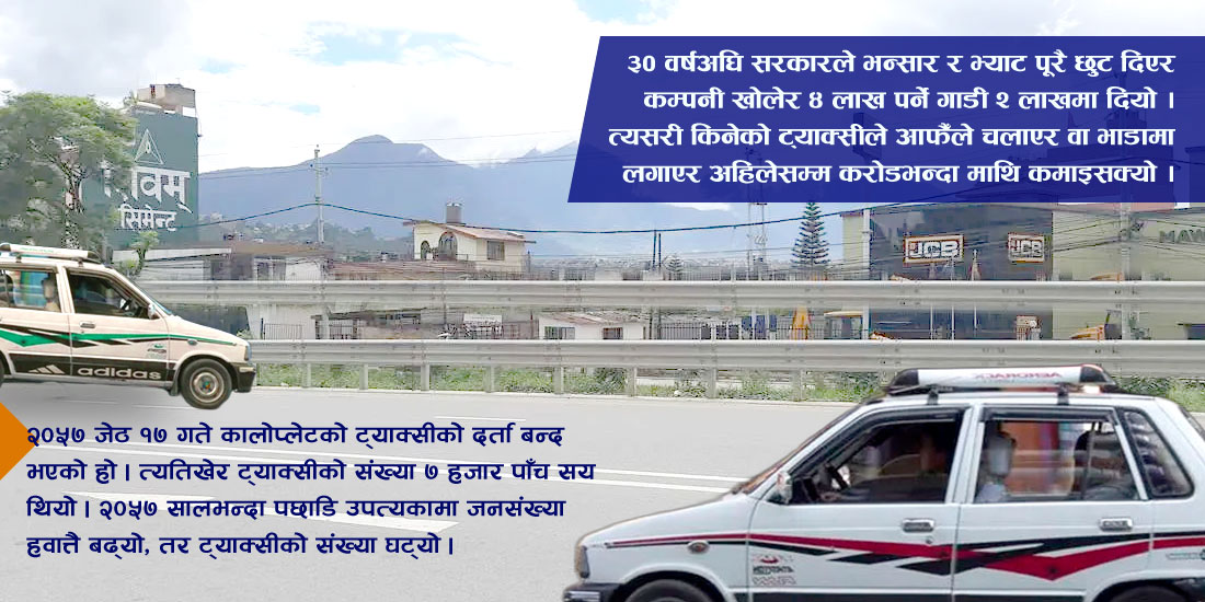 ३० वर्षअघि सरकारले भन्सार र भ्याट पूरै छुट दिएर कम्पनी खोलेर चार लाख पर्ने गाडी दुई लाखमा दियो । दुई लाखमा किनेको ट्याक्सीले आफैँले चलाएर वा भाडामा लगाएर अहिलेसम्म करोडभन्दा माथि कमाइसक्यो । ३२ वर्षमा उपत्यकाको जनसंख्या ह्वात्तै बढ्यो, तर ट्याक्सीको संख्या जहाँको त्यहीँ रह्यो । अहिले २० वर्षे पुरानो ट्याक्सीको स्क्राइभ गरेको नम्बरप्लेट १२ देखि १५ लाखमा खरिद बिक्री हुन्छ । यही नम्बरप्लेटमा नयाँ गाडी किनेर ट्याक्सीमा दर्ता गरिन्छ । यसले एकातिर ट्याक्सीको संख्या बढ्न सकेको छैन भने अर्कातिर एउटै व्यक्तिले मात्र व्यवसाय गरिरहेको छ ।