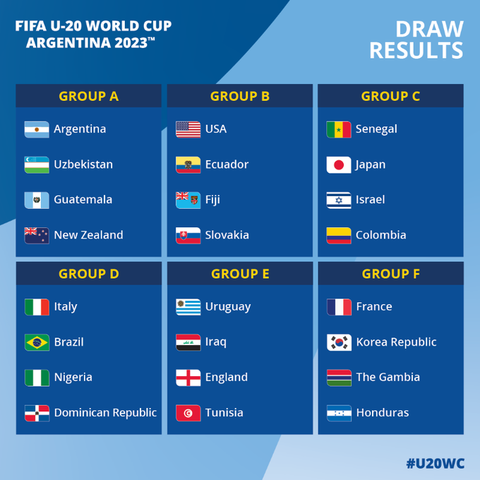 काठमाडौं । अर्जेन्टिनामा आगामी महिना हुने फिफा यू-२० विश्वकपको ‘ड्र’ सार्वजनिक भएको छ । आयोजक अर्जेन्टिनाले उज्वेकिस्तानसँग खेल्दै विश्वकपको सुरुवात गर्ने भएको छ।