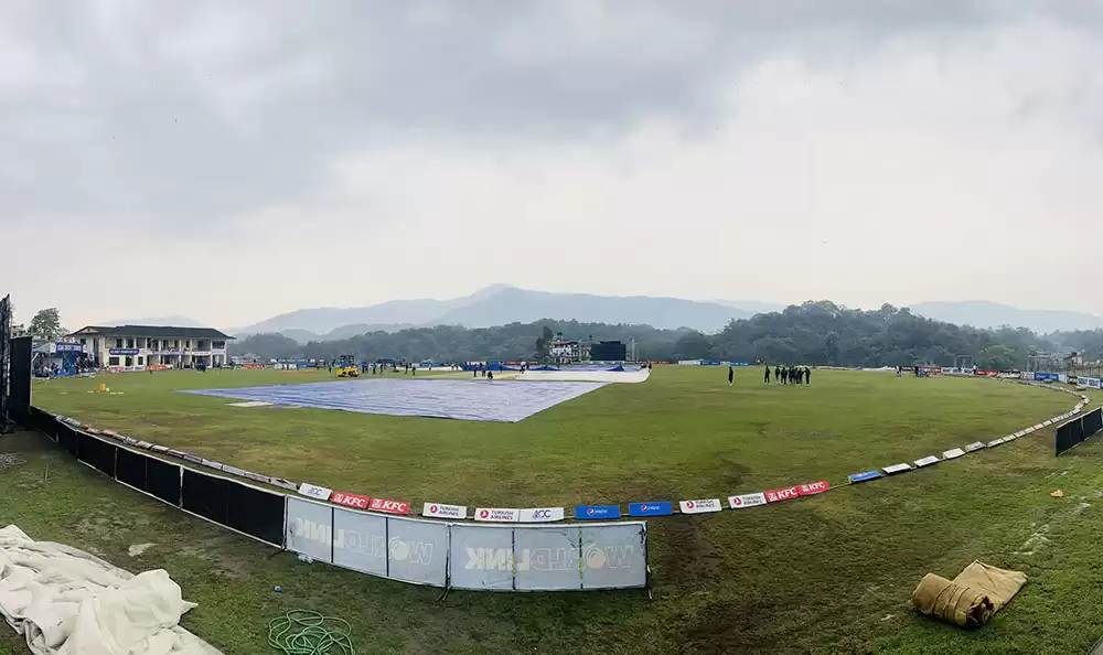 गएराती पनि पानी परेकोले मैदानमा पानि रहेको छ र मैदानमा खटिएका कर्मचारीले पानी सुकाउने प्रयास गरिरहेका छन् । नेपाकी कप्तान रोहित पौडेल र मुख्य प्रशिक्षक मोन्टि देशाईले मैदान निरिक्षण गरिरहेका छन् ।