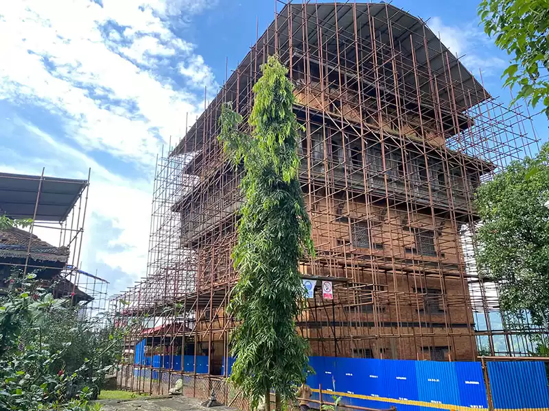 “विसं २०७६ साउनमा पहिलो पटक कार्यक्षेत्रमा आइपुगेको चिनियाँ पक्षले साततले दरबार र तुलजा (तलेजु) भवानीको मन्दिरलाई थप क्षति हुनबाट जोगाउन खट बनाएर नयाँ वर्षपछि (सन् २०२०) फर्किने भनेर गएका थिए”, उनले भने, “चिनियाँ कम्पनीका प्राविधिक स्वदेश फर्केलगत्तै सुरु भएको कोरोना रोगको जोखिमले रोकिएको पुनःनिर्माण अघि बढाउन प्राविधिक अध्ययनको टोली दरबार क्षेत्रमा आए पनि काम सुरु हुन बाँकी छ ।”