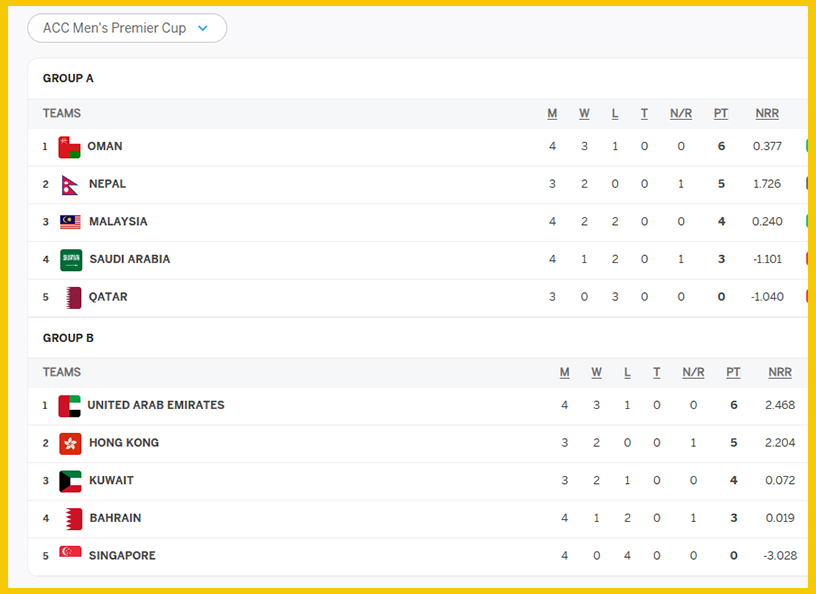 काठमाडौँ । एसीसी प्रिमियर कप अन्तर्गत आज दुई खेल हुदै छन् । प्रिमियर कप अन्तर्गत आज समुह चरणका अन्तिम खेलहरु हुनलागेका हुन् ।