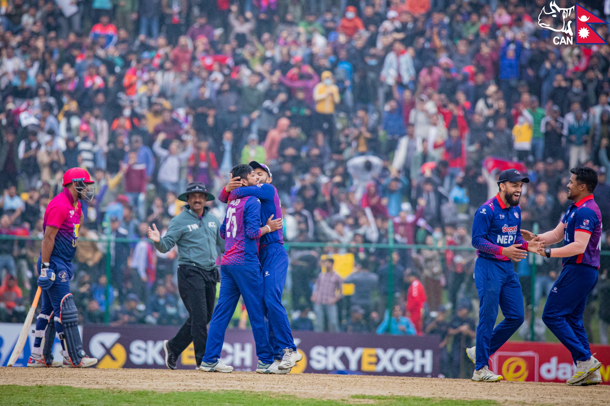 आज त्यहीँबाट खेल सुरु भएको हो । ललित राजवंशी ह्याट्रिक बलमा थिए । तर उनी ह्याट्रिक विकेट लिनबाट चुकेका छन् । उनले चार विकेट लिएका छन् ।
