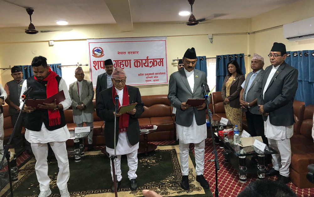 रूपन्देही । लुम्बिनी प्रदेशका नव नियुक्त तीन मन्त्रीले प्रदेश प्रमुख अमिक शेरचन समक्ष पद तथा गोपनियताको शपथ ग्रहण गरेका छन् ।