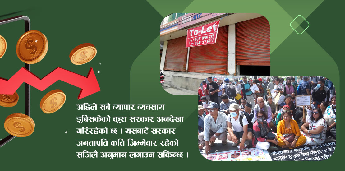 पछिल्लो समय बैंक तथा वित्तीप्य संस्थाबाट ऋण लिएका ऋणी र व्यापार व्यवसायीले आत्महत्या गरेको पनि ज्वलन्त उदाहरण छन् । सर्वसाधारण जनता अहिले मुलुकमा सरकार नभएको दाबी गर्छन् । यदि सरकार भएको भए यस्तो अवस्था नआउने उनीहरूको ठम्याइँ छ । किनकि सरकार भनेको जनता र राष्ट्रको हितमा काम गर्ने जिम्मेवार संस्था हो । तर, यहाँ त जनताको जीवनस्तर उम्काउने भन्दा पनि उनीहरूलाई कसरी डुबाउने भन्नेतिर सरकार लागिपरेको जनताको भनाइ छ ।