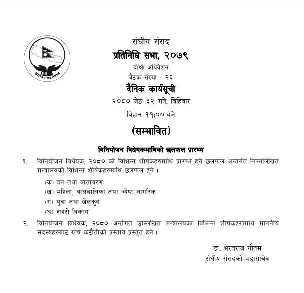 बैठकमा वन तथा वातावरण मन्त्रालय, महिला, बालबालिका तथा ज्येष्ठ नागरिक मन्त्रालय, युवा तथा खेलकुद मन्त्रालय र शहरी विकास मन्त्रालयका विभिन्न शीर्षकमाथि खर्च कटौतीको प्रस्ताव प्रस्तुत गर्ने सम्भावित कार्यसूची रहेको छ ।