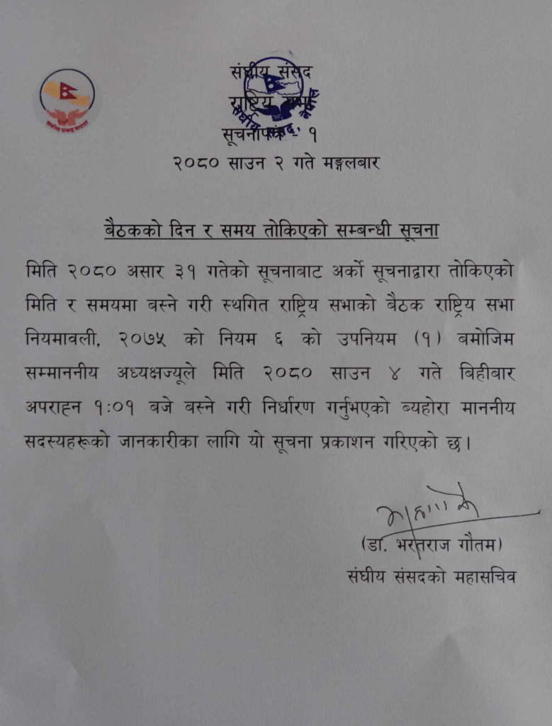 तर, मंगलबार संघीय संसदका महासचिव डा भरतराज गौतमले स्थगित राष्ट्रिय सभाको बैठक ४ साउन बिहीबार दिउँसो १ः०१ बजे बस्नेगरी बोलाइएको जानकारी दिएका छन् ।