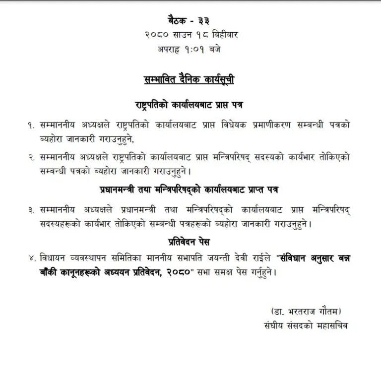 संसद् सचिवालयले सार्वजनिक गरेको सम्भावित कार्यसूची अुनसार राष्ट्रपतिको कार्यालयबाट प्राप्त विधेयक प्रमाणीकरण सम्बन्धी पत्र पढेर सुनाउने कार्यसूची छ ।