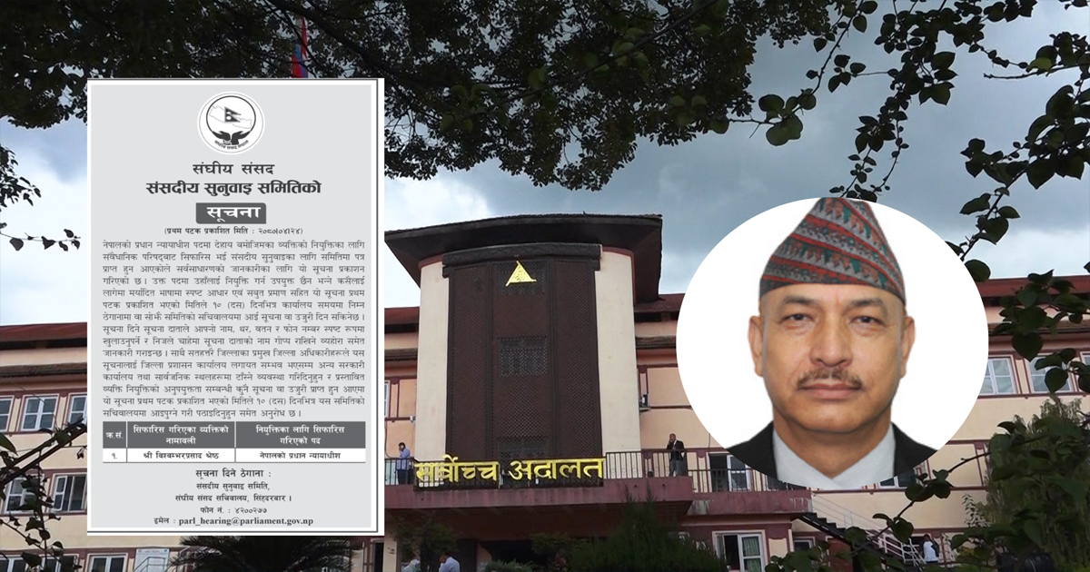 काठमाडौं।संवैधानिक परिषद्बाट प्रधानन्यायाधीशमा सिफारिस भएका न्यायायधीश विश्वम्भरप्रसाद श्रेष्ठविरुद्ध उजुरी आह्वान भएको छ । संघीय संसद्को संसदीय सुनुवाइ समितिले बुधबार सार्वजनिक सूचना प्रकाशित गर्दै श्रेष्ठविरुद्ध उजुरी आह्वान गरेको हो ।