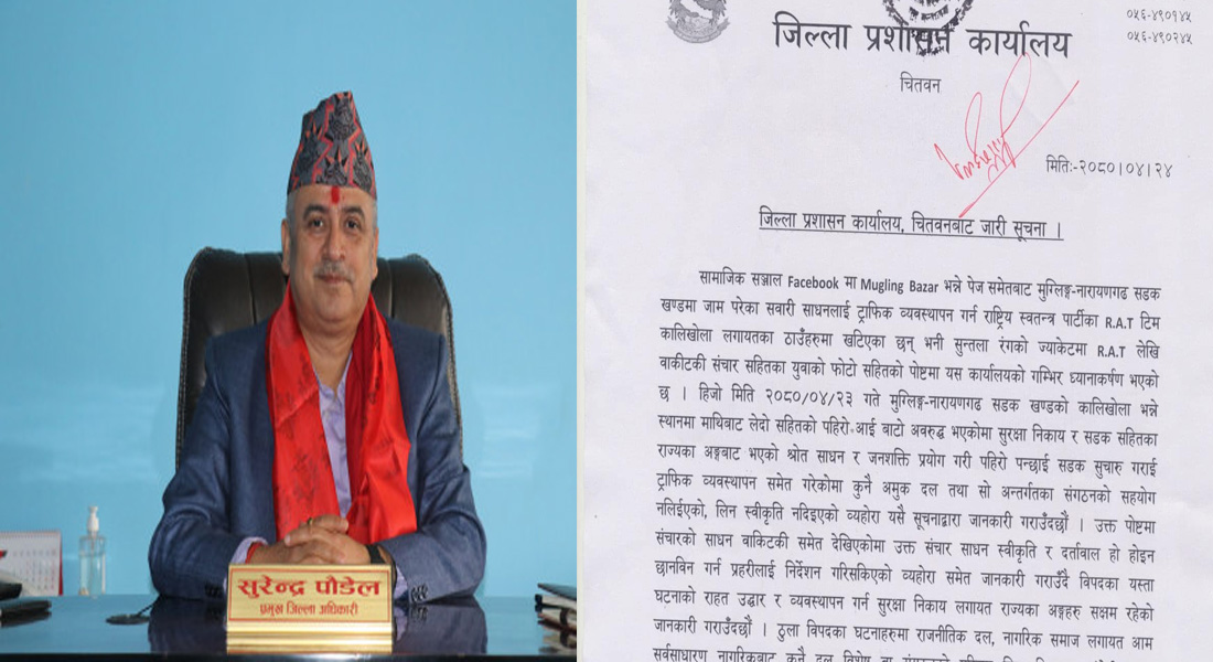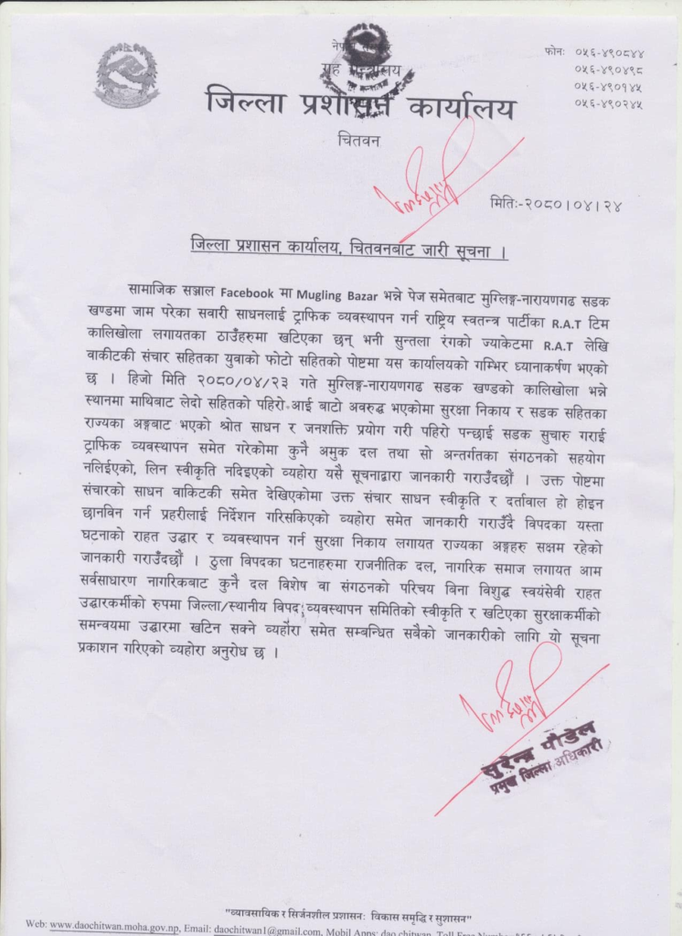 जिल्ला प्रशानसन कार्यालय चितवनले बुधबार एक विज्ञप्ती जारी गर्दै पहिरोका कारण अवरुद्ध सडक संचालनमा ल्याउन सुरक्षा निकाय र सडक सहितका राज्यका अङ्गबाट भएको श्रोत साधन र जनशक्ति प्रयोग गरी पहिरो पन्छाई सडक सुचारु गरेर ट्राफिक व्यवस्थापन समेत गरेको जनाएको छ । चितवन जिल्ला प्रशासनले उक्त कार्य गर्न कुनै अमुक दल तथा सो अन्तर्गतका संगठनको सहयोग नलिईएको र लिन स्वीकृति नदिइएको बताएको छ ।